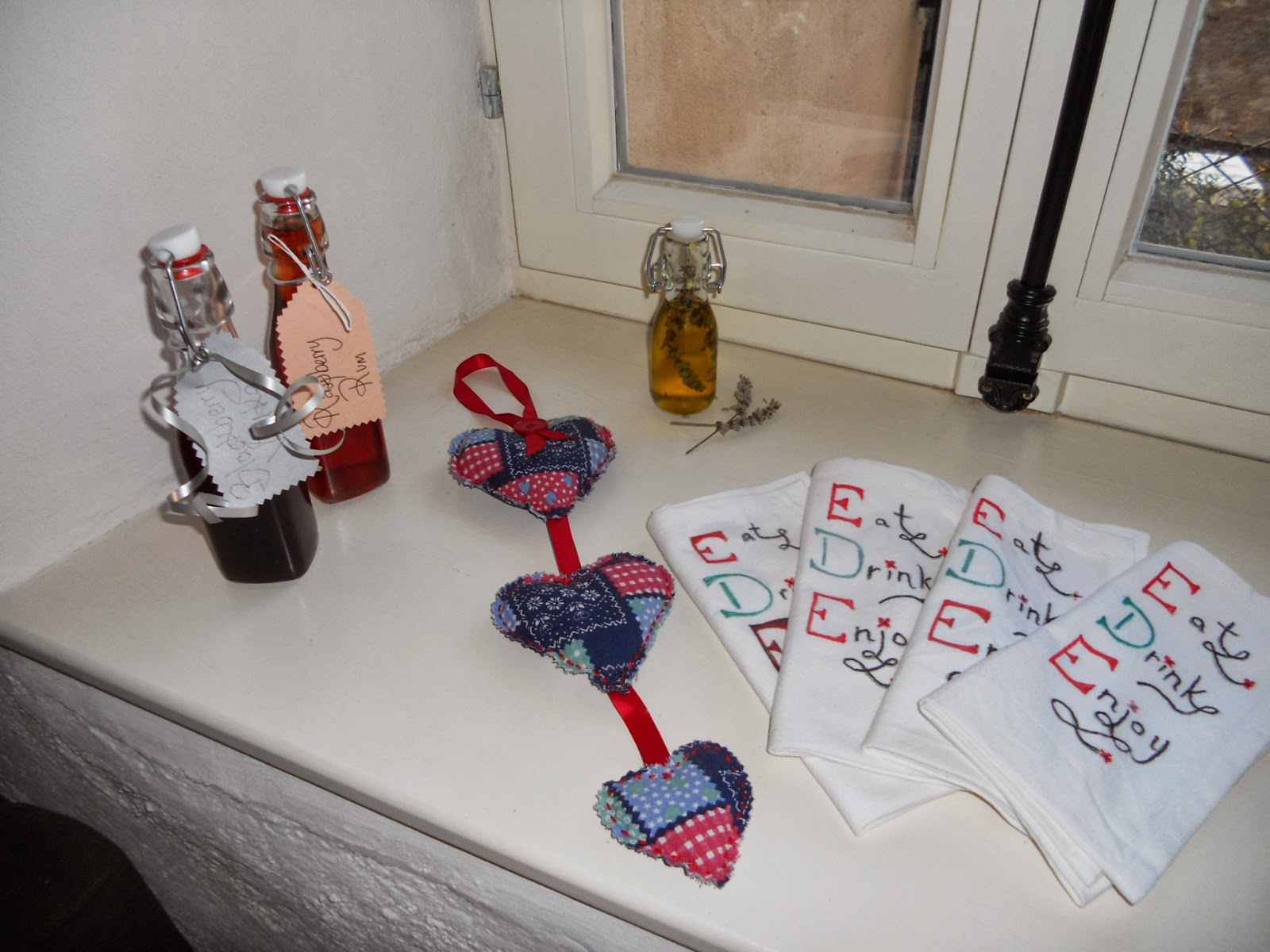 I HAVE MADE A TRIO OF HEARTS FILLED WITH LAVENDER,(LAVENDER HAND PICKED IN THE SUMMER) COTTON NAPKINS WHICH I DECORATED USING DYLON FABRIC PENS, RASPBERRY RUM, BLACKBERRY VODKA AND LAVENDER MASSAGE OIL.
